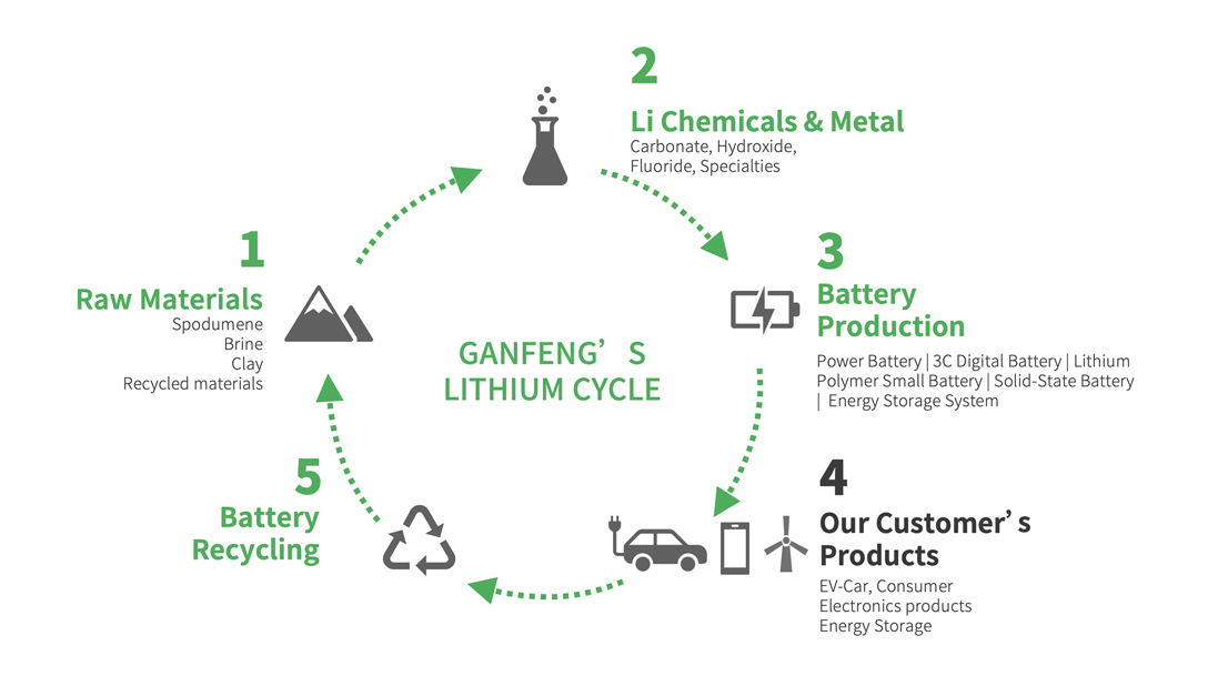 As the world's leading lithium eco-enterprise, Ganfeng Lithium's business segments cover from upstream 'lithium resource development', midstream' lithium refinery and lithium metal smelting', to downstream' lithium battery manufacturing and battery recycling'. Our products are widely used in EVs, energy storage systems, 3C products, chemicals and pharmaceuticals, etc.